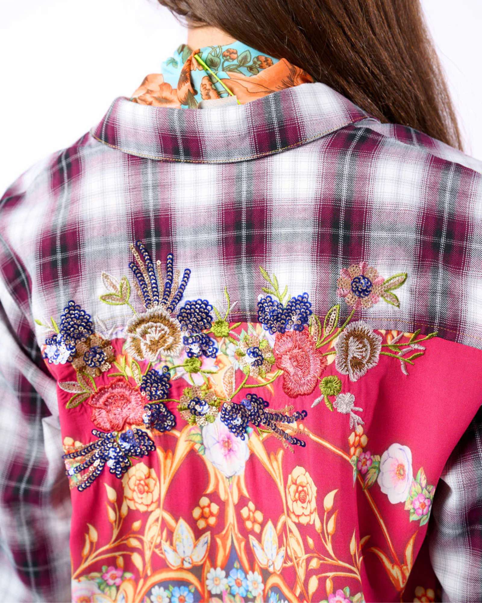 - Long sleeve button-up plaid shirt with sequin embroidered floral print back, decorative crystal buttons & floral tasseled pin attached to CF placket, 2 front pockets, floral jacquard rollover sleeve tabs, high-low metallic gold scallop hem