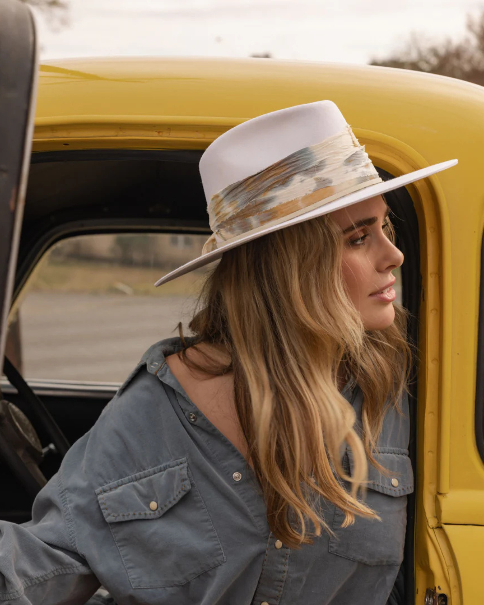 - A flat brimmed fedora accented by hand-dyed raw-edged recycled silk and ivory leather cord finished with a custom Freya hat pin