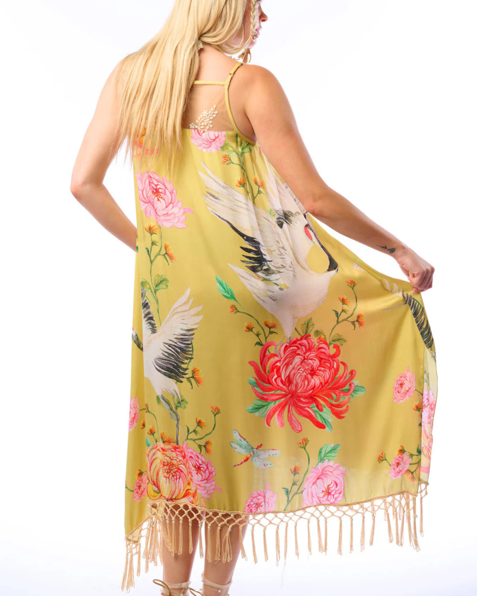 - Crane floral print adjustable strap dress, sequin embroidered mesh back yoke, knotted fringe hem