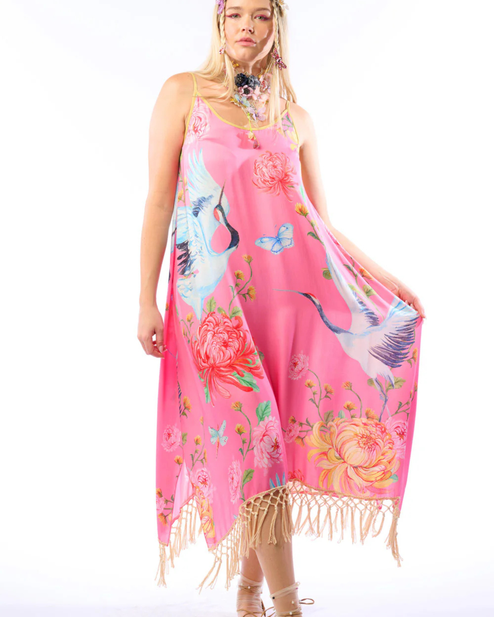- Crane floral print adjustable strap dress, sequin embroidered mesh back yoke, knotted fringe hem