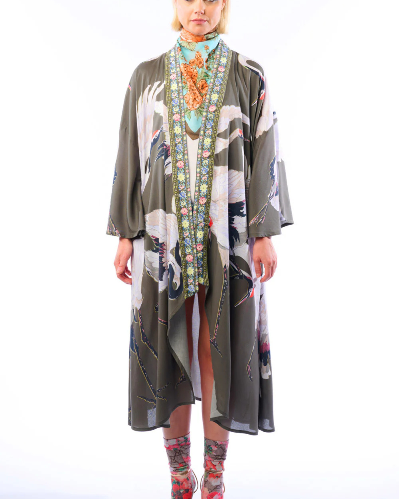 - Crane print kimono with contrast floral print CF/neck band, flare sleeves, side pockets