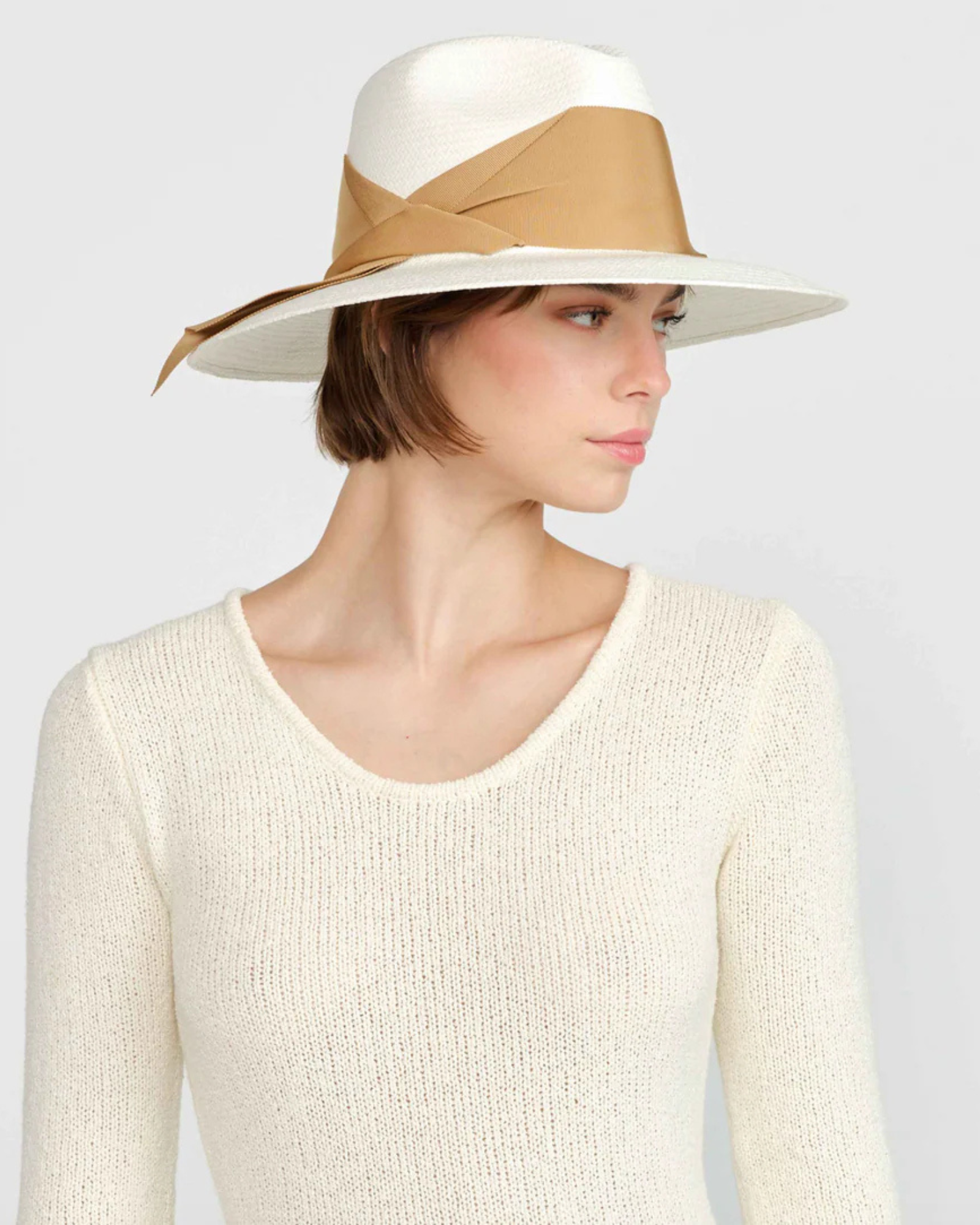 - Natural straw fedora with broad brim and oversized grosgrain band, wrapped asymmetrically around the hat and finished with a modern angular fold.