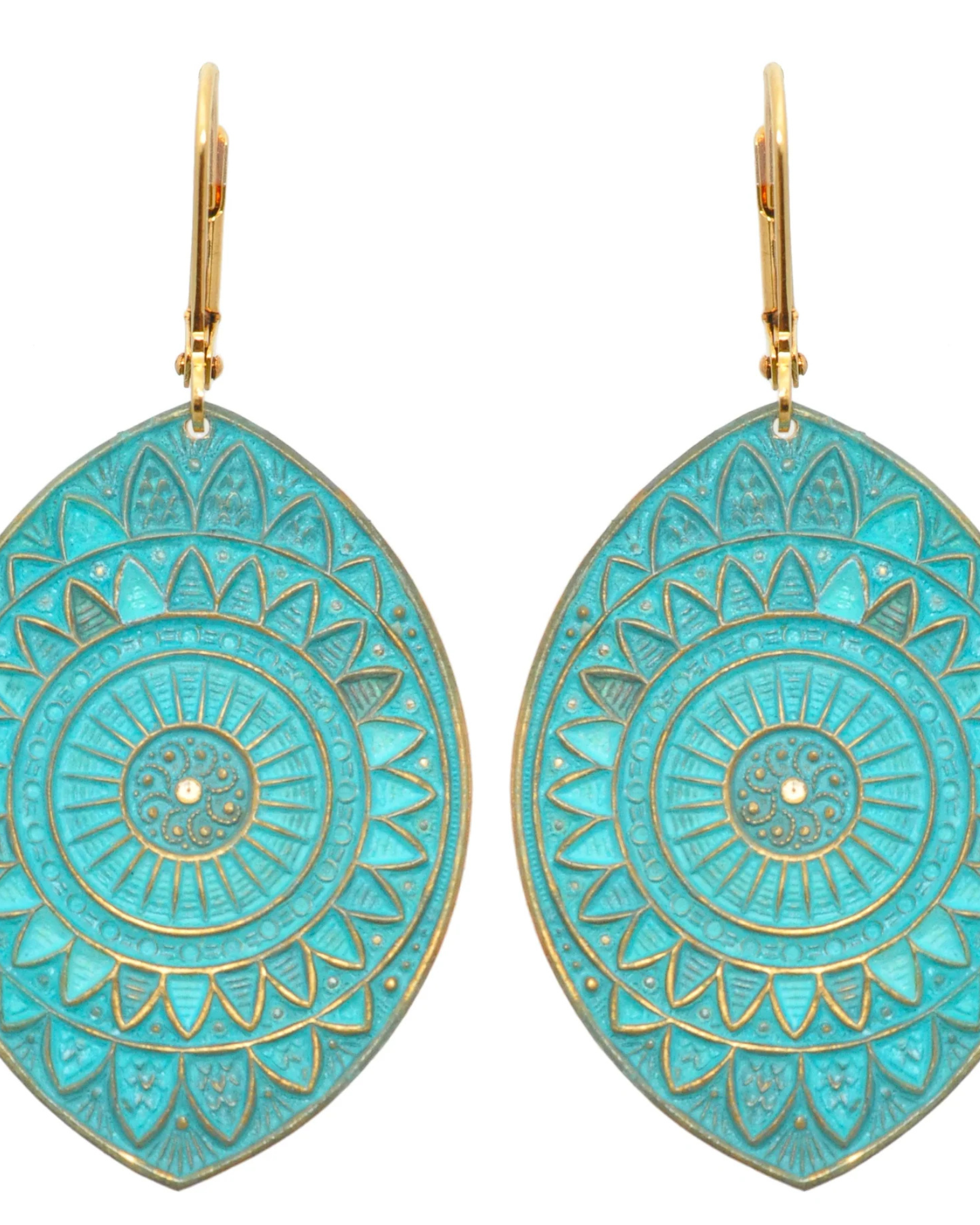 Hung from gold-plated lever backs, these patterned wonders are hand finished with a bright patina. Nickel and lead free.