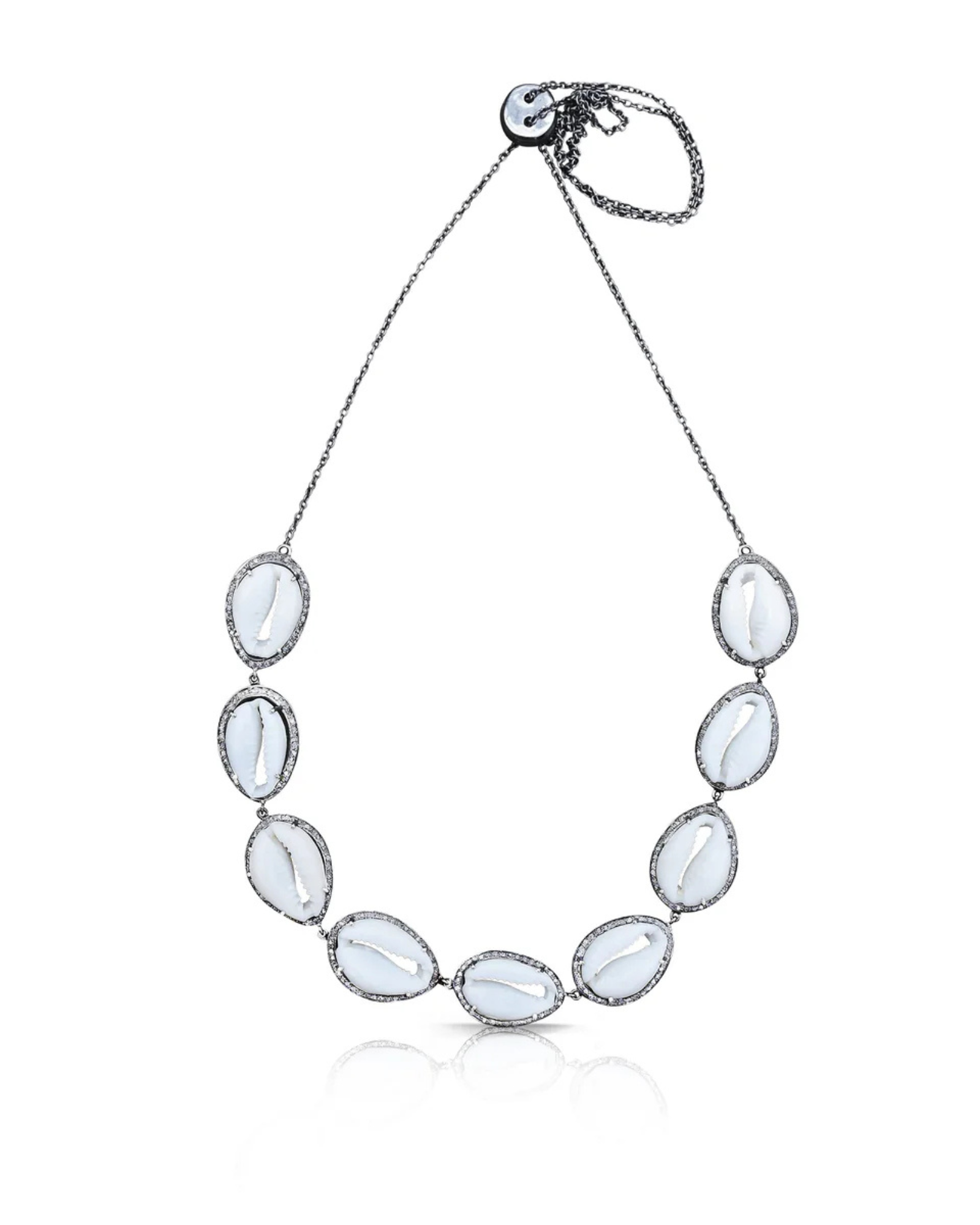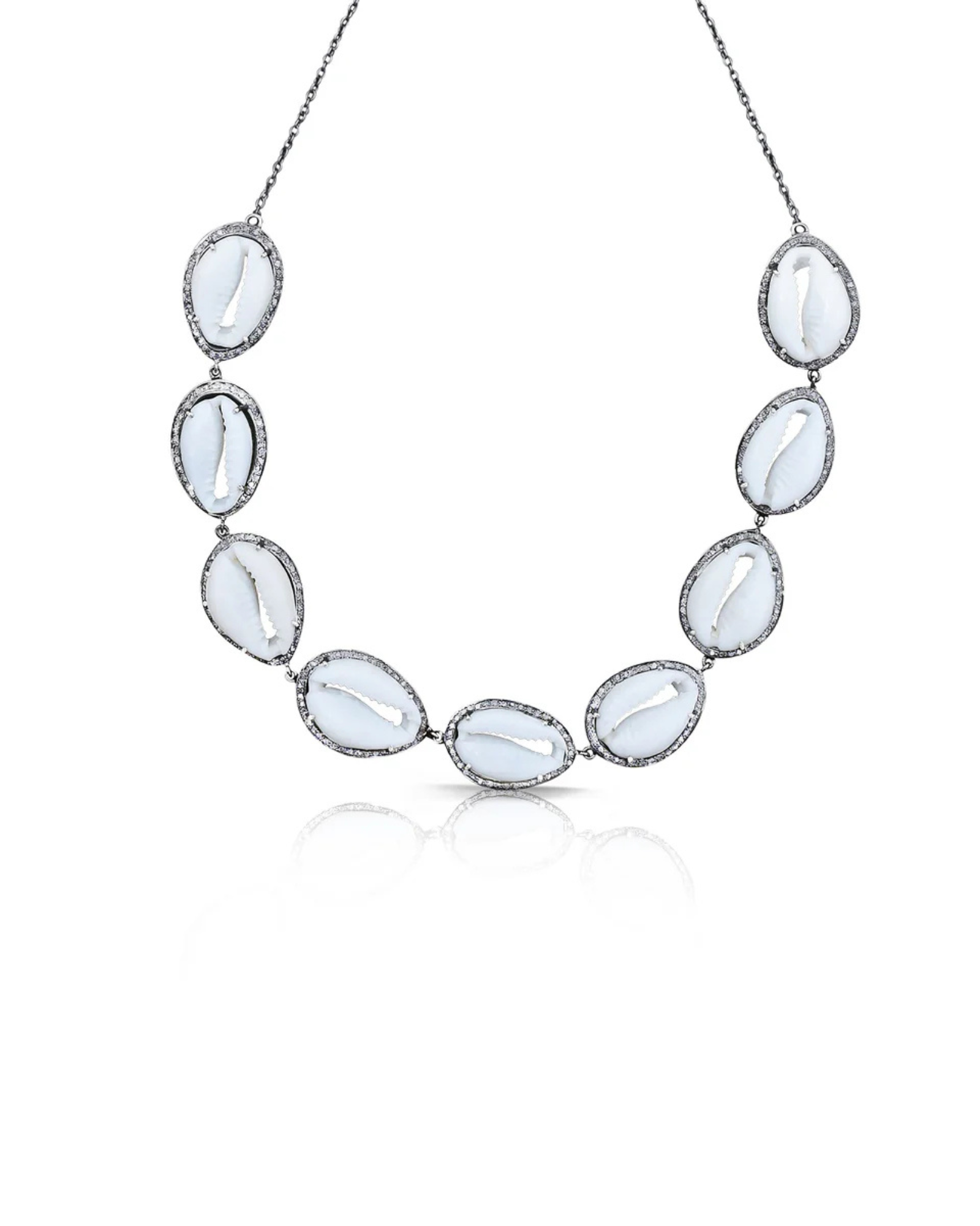 - Crafted with 9 sliced cowrie shells, each surrounded by pave diamonds set in sterling silver.