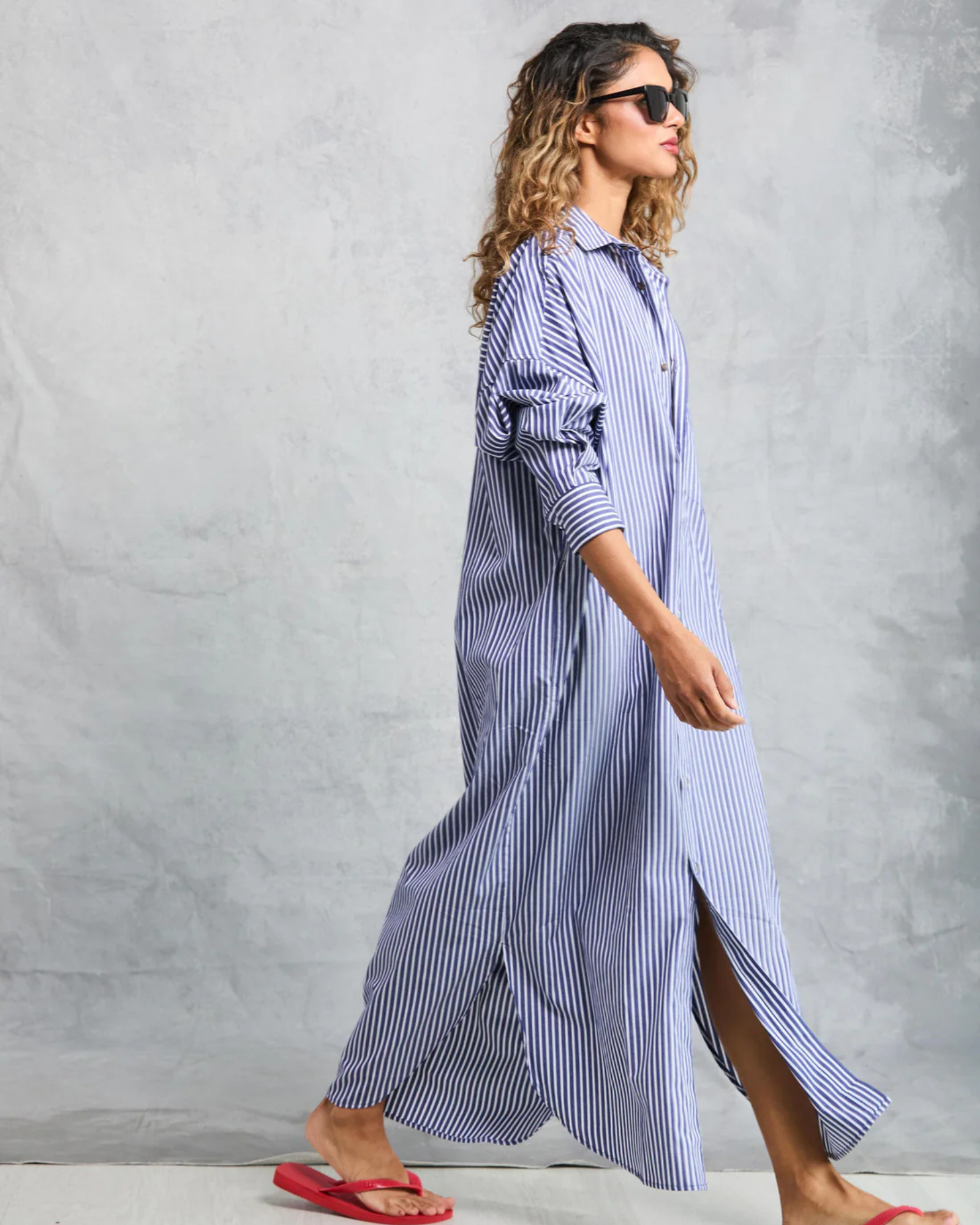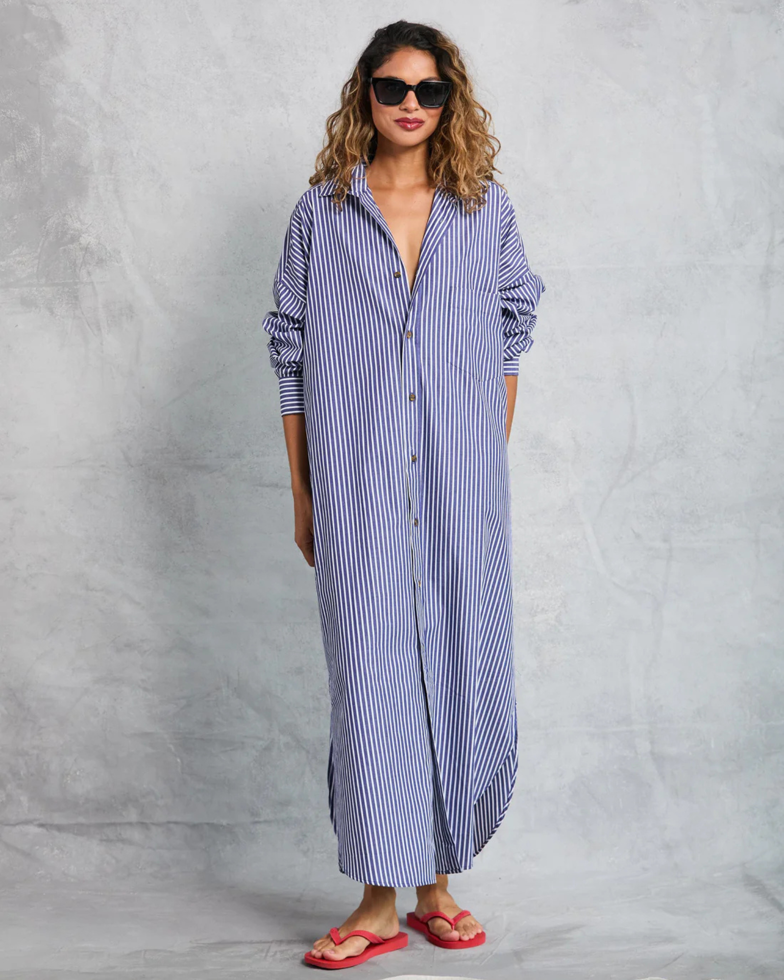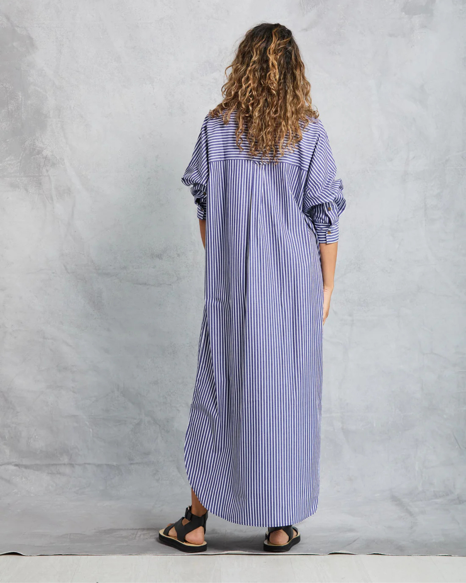 Oversized, everyday shirtdress in crisp cotton poplin with navy and white stripes. Button-down, ankle-length with side slits, front + side pockets.