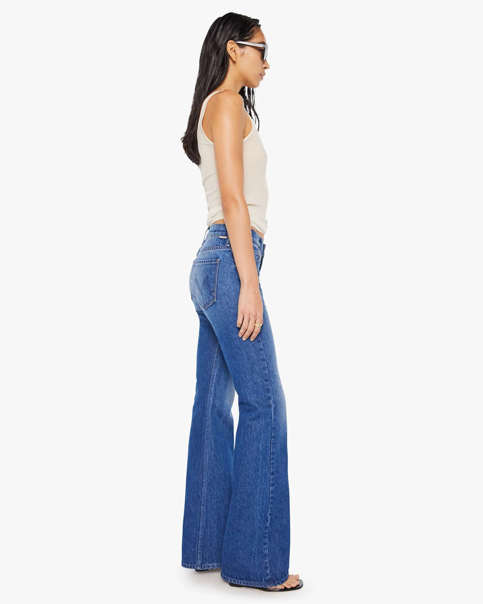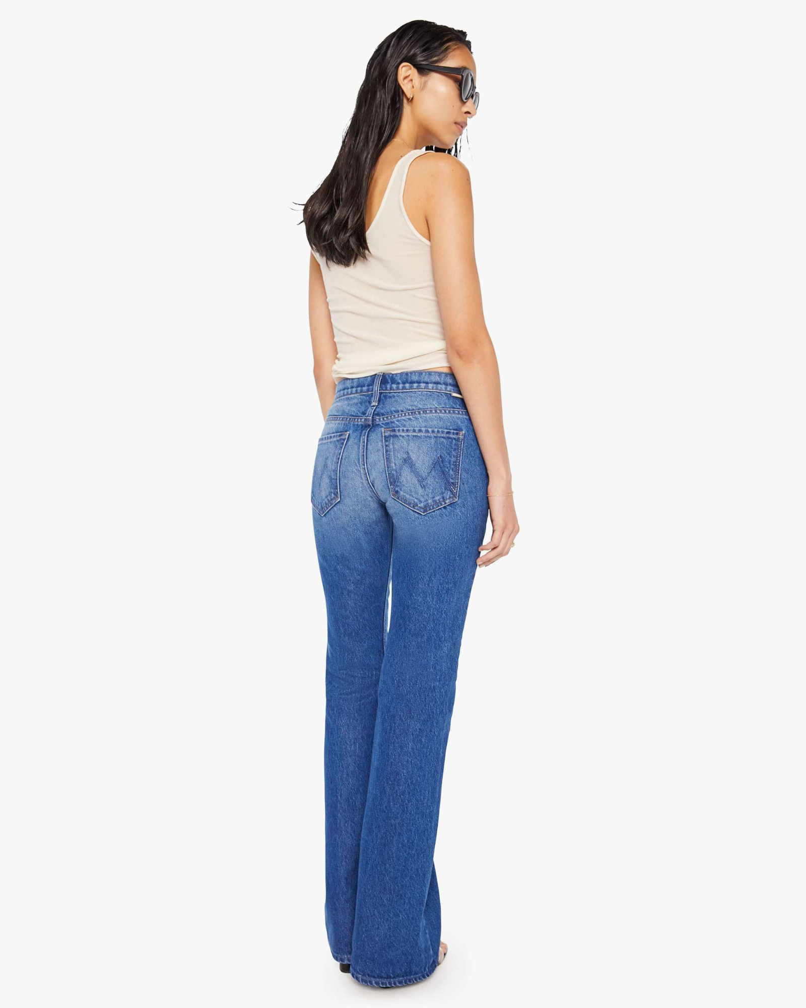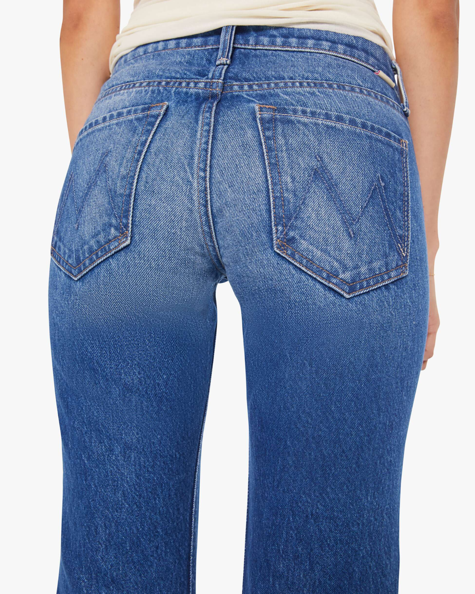 A bootcut jean from SNACKS!, a collection of unconstrained silhouettes leaning into exaggerated shapes and extreme proportions. Experimental and non-era specific. For everyone, or not. The low-rise jeans feature a slightly flared leg and a long 34-inch inseam with a clean hem. Made from a rigid recycled cotton blend, Scrumptious is a mid-blue with fading, whiskering, a pretzel-detailed button and candy-inspired interior rivets.
