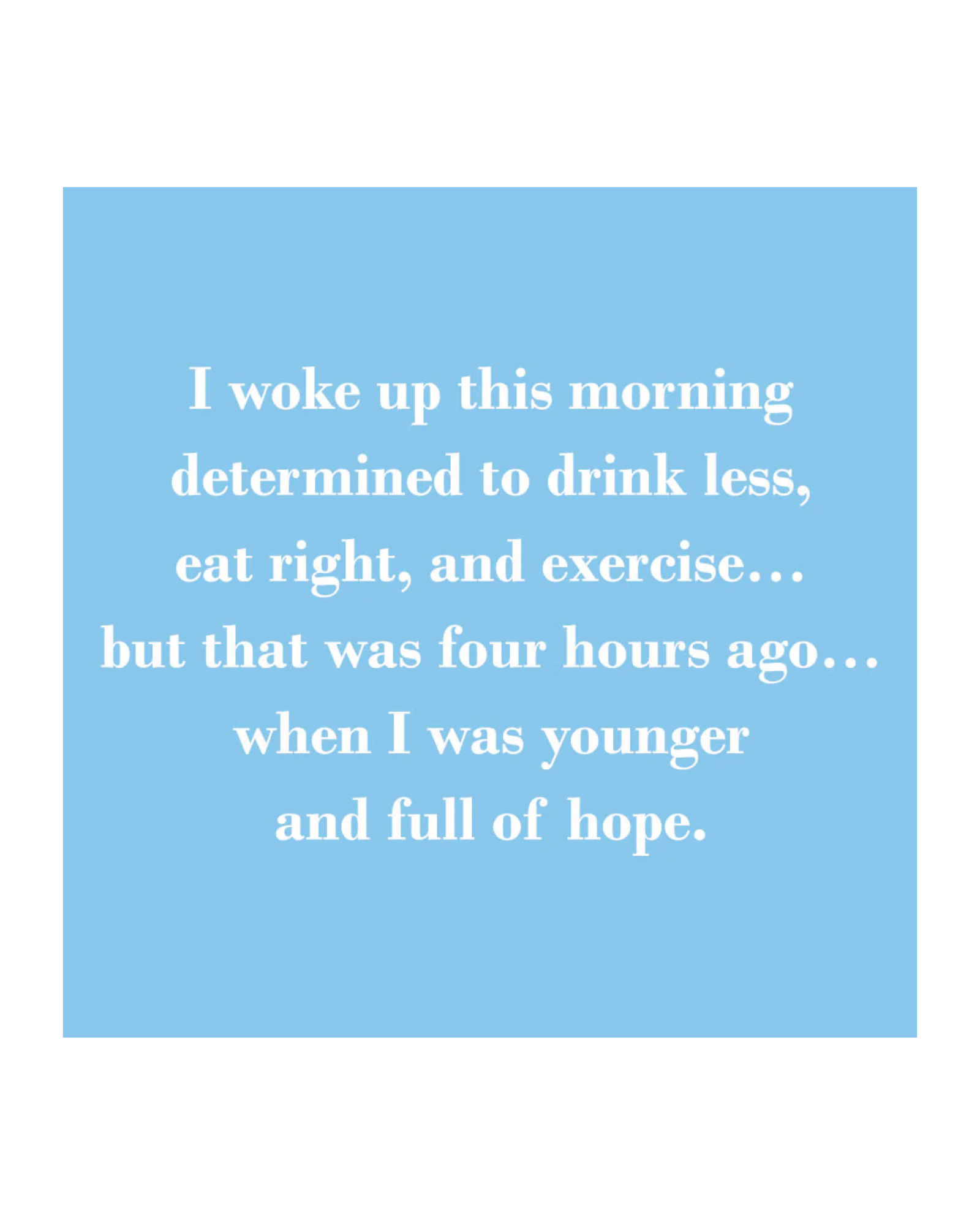 I woke up this morning determined to drink less, eat right, and exercise...but that was four hours ago...when I was younger and full of hope, cocktail napkin is perfect for your next girls’ night or cocktail party! This emerald green and white cocktail napkin is such a fun addition to any party or luncheon! Both men and women love this fun saying! Mary Phillips cocktail napkins toss out the underlining element of fun and attitude, making yours an event they’ll not soon forget. You can also pair this little number with a bottle of wine for a most coveted hostess gift! Each pack contains 20 5 x 5 three-ply cocktail napkins *super thick* packaged in polypropylene. Stock up for your next book club or to give to the hostess!